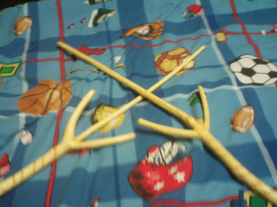 Boychild has been working on his wood carving skills and is very fascinated with the various weapons we may eventually have the chance to work with in karate - for now he's limited to num chuks along with his hands and feet.